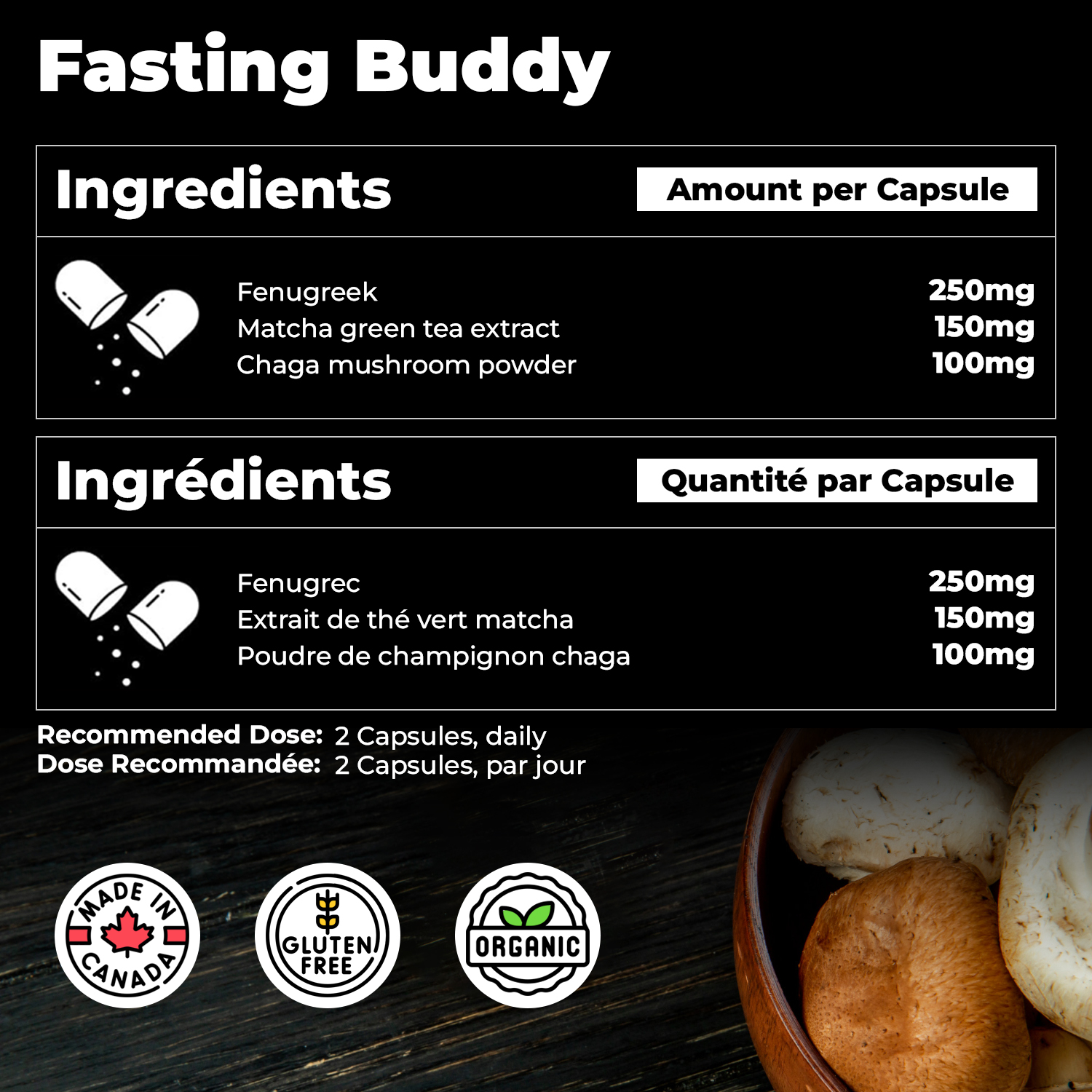 ‘Fasting Buddy’ empowers you to stay on track with your fasting goals. It serves as an appetite suppressant to help you manage your hunger, improve portion control, and enhance your fasting success. With the power of Fenugreek, Matcha, and Chaga, ‘Fasting Buddy’ not only curbs cravings but also provides the benefits of natural energy supplements to support your journey to wellness.