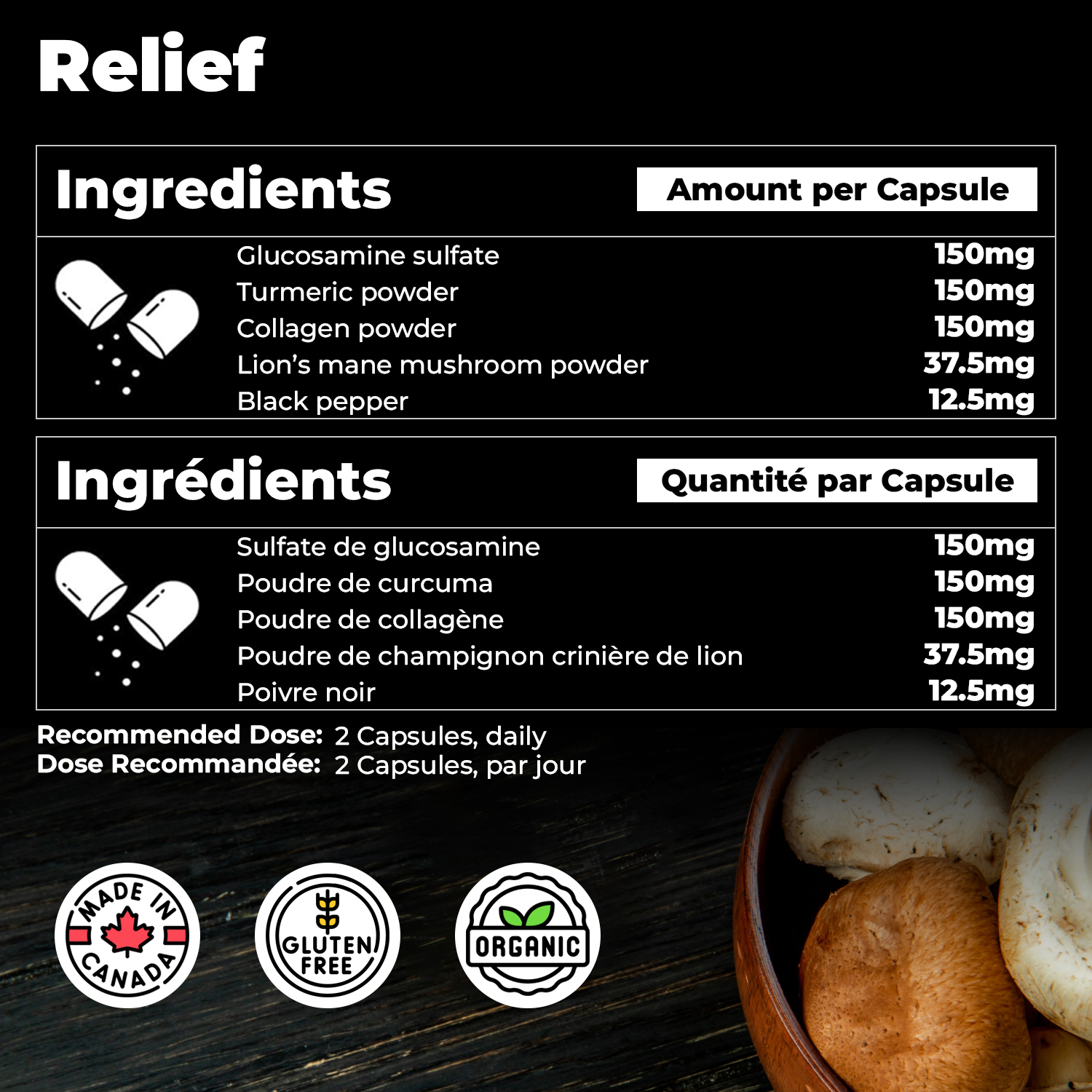 Say goodbye to nagging aches and pains with ‘Relief’ – the perfect combination of joint and muscle support supplements. Whether you’re looking for natural anti-inflammatory solutions or help with muscle repair, ‘Relief’ has everything you need to rediscover a life of comfortable movement. Your body will thank you!